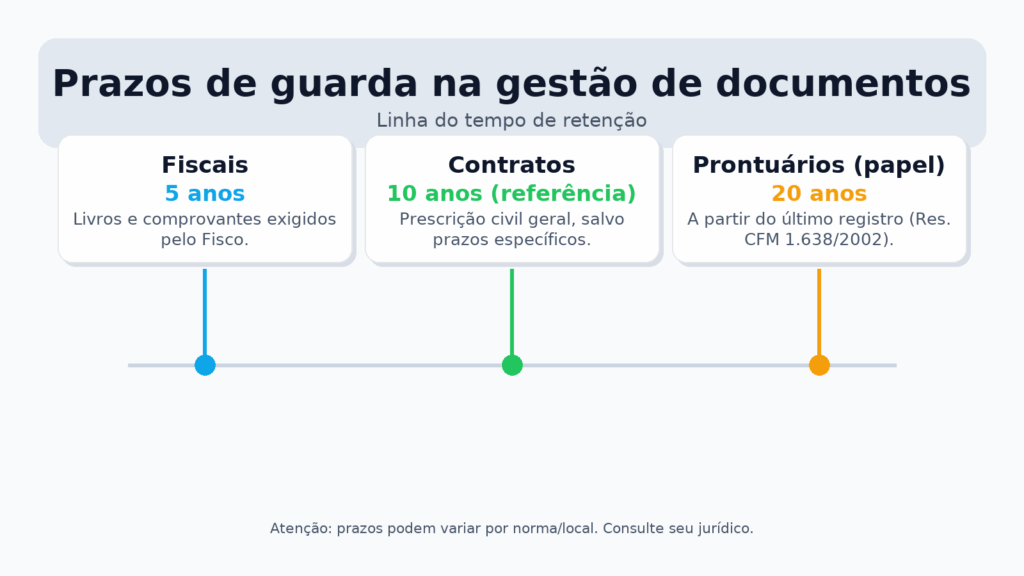 - Prontuários médicos: 20 anos no suporte em papel a partir do último registro, conforme Resolução CFM nº 1.638/2002 (Art. 4º).